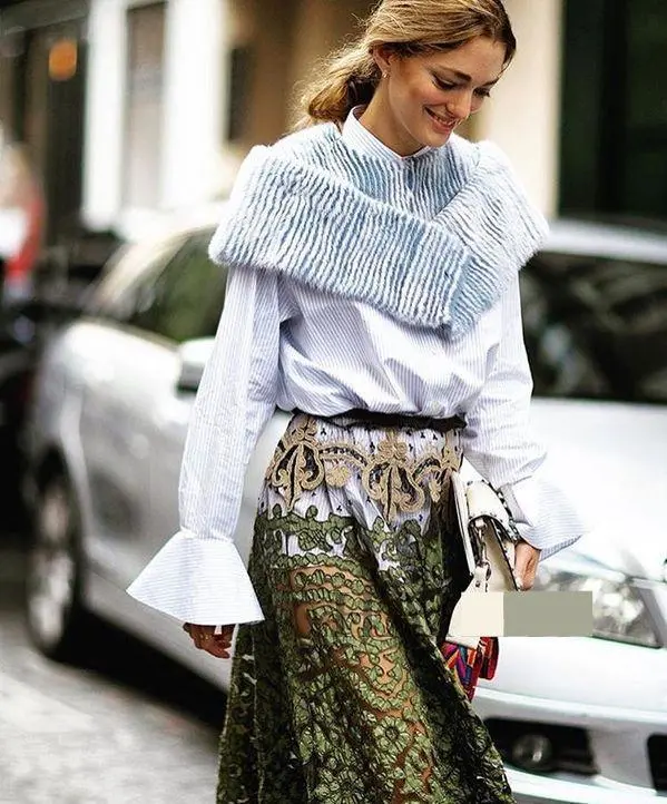 对于纱裙,我们可以把眼光看远一点,选择这种既具有纱裙的飘逸感,又百搭的百褶长裙,百褶裙一直都以一件超好搭配的单品,无论我们怎么搭,都能穿出时尚感,想要更有纱裙的感觉,就可以选择颜色浅一点百褶裙。