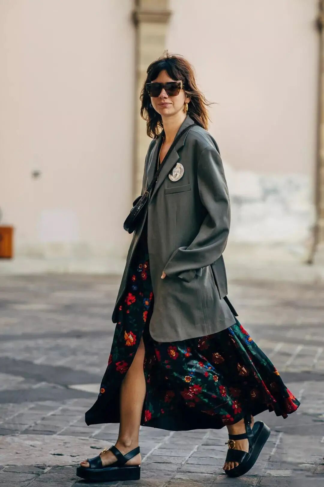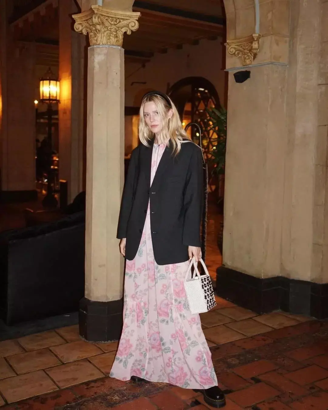 把碎花的面积减少,是穿碎花元素的小技巧,而且要注意选择碎花时也要尽量选择深色基调,或者无彩色系(黑白灰)基调,千万不要一件衣服上碎花的颜色各色各样,像黑底白花、白底黄花或者蓝底白花,都是优秀的选择。碎花裙の穿搭技巧:①长短相结合突出腰线把夏装和秋装搭配一起,既能保暖还能保持时尚,并且,用外套减少碎花的面积,除了搭配休闲的短夹克,搭配短款的小西装就能穿去职场,这样,像碎花这种比较随意的元素,职业女性在职场也能穿了。