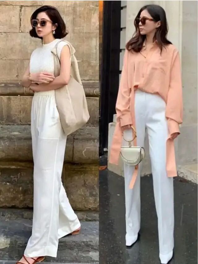 如果我们选择了一件有设计感的时尚单品,那么就用经典的基础款来搭配,比如这位小姐姐,选择了珊瑚橘色的衬衫,袖子与衣襟上的长飘带显得非常个性,很时尚,那么下装就选择很简约的白色西装裤来搭配,给人的感觉就不会显得过于扎眼,时髦又不失干练利落的通勤风格,既帅气又大方,觉得非常青春。