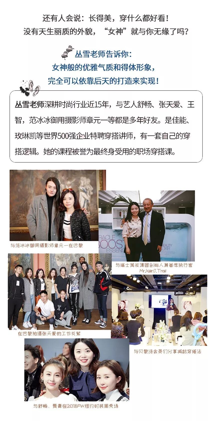 给大家推荐《瑞丽伊人风尚》创意总监丛雪老师,丛雪老师不仅帮助过范冰冰,而且还贴身为张天爱、舒畅、王智等明星做过穿搭指导,他们穿着丛雪老师为他们设计的穿搭登上了巴黎时装周、纽约时装周。