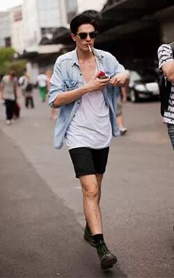 首先,打篮球、踢足球的运动短裤不适合在运动场所以外的地方穿。其次,如果男生的身材很好,当然可以穿紧身的,不过紧身的副作用是容易显得有些“娘”。所以,对于一般人来说,修身偏宽松的款式会更容易驾驭,而且宽松款不会像紧身款那样显得腿短。另外,垮档裤和很多口袋的工装短裤,特别容易让男生变得很“宅”。