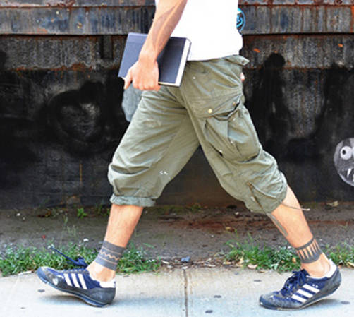 运用松身与长版的单品与短裤组合,选择露膝短裤,让腿部面积大量露出,有助于拉长腿部线条,并以袜子搭配凉鞋穿出街头风格。