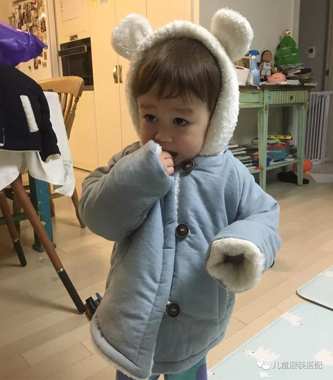 穿上兔耳朵的毛绒绒的浅蓝色棉服,简直萌化了,这种款式的外套,很适合宝贝在冬天穿着,既保暖又可爱~