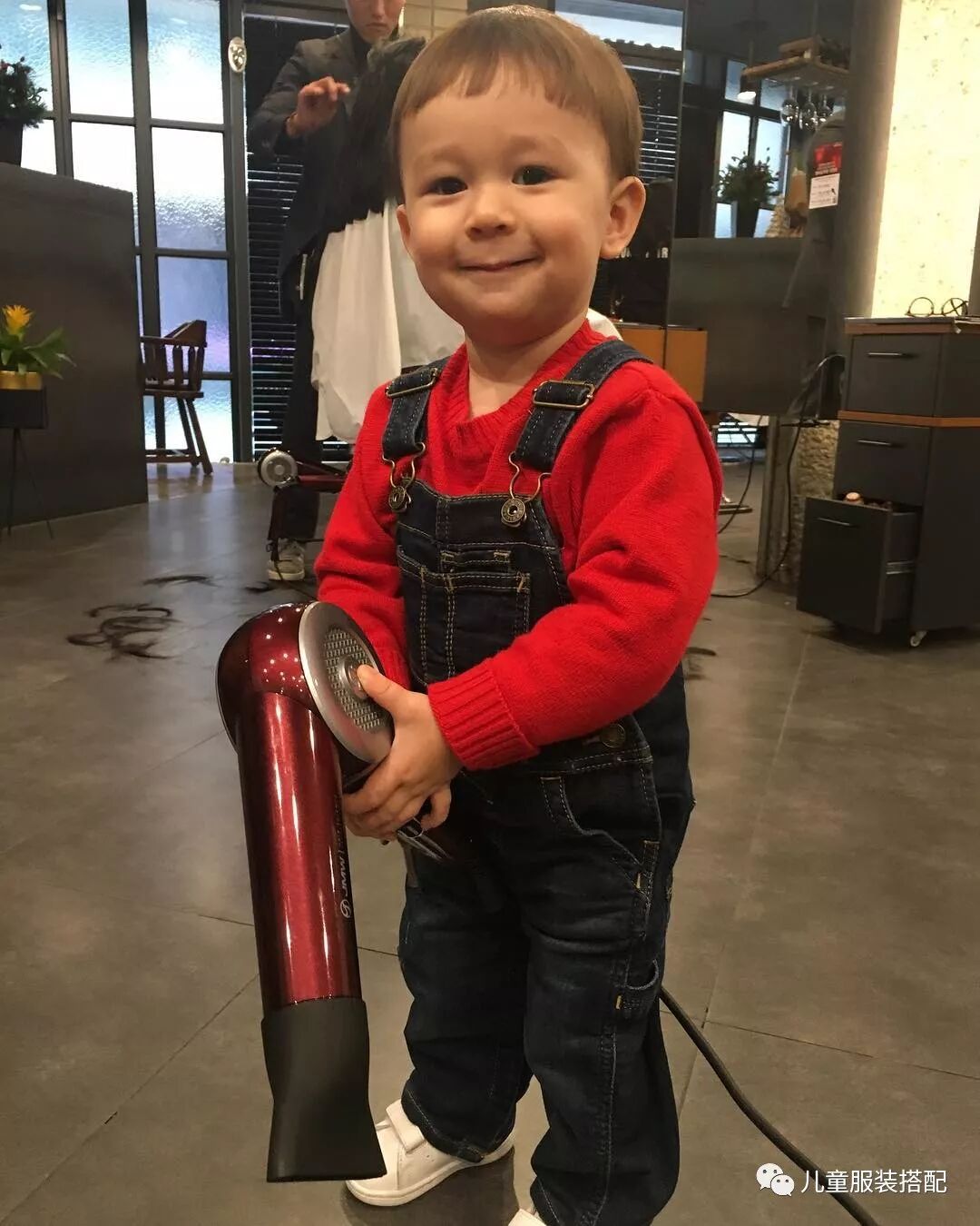 男宝贝穿上背带仔裤,也是非常可爱有范的,内搭红色毛衣,配上小白鞋,既有活力又可爱~
