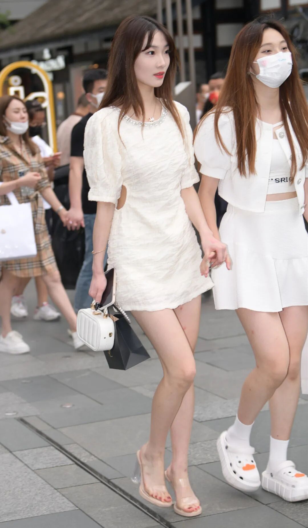 人们的心态不同,往往对美丽的事物有不同的感受,有些人觉得翠绿的小草,鲜艳的花朵是美景,也有些人认为穿得好看的女生是风景线,正好在下也是如此认为的,会穿的女生一般都很自信的,好朋友也会很多,相信和她一起逛街的好姐妹,也属于时尚达人一类的吧!图中两位女生相约逛街,虽然美得各具风采,但穿搭风格却很相似,全部离不开裙子的点缀,右边女生穿了一件连衣裙,大众又经典的款式,圆领的剪裁,不像一字领那样时髦靓丽,但也能秀出女生的锁骨线条。