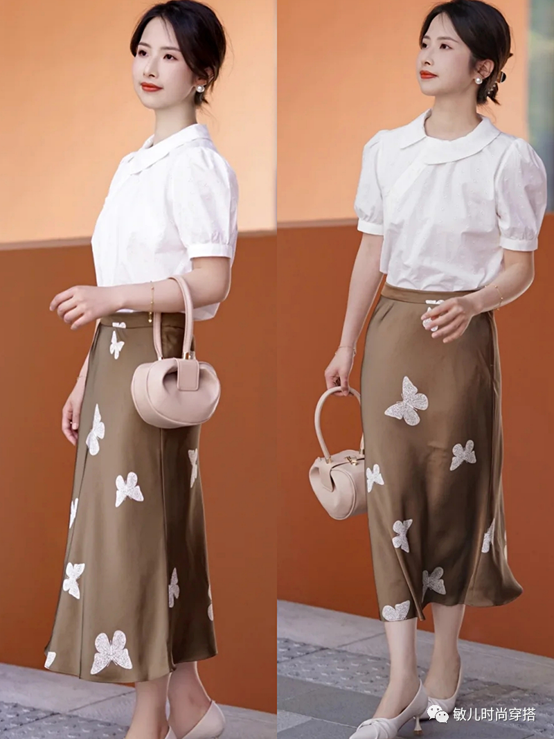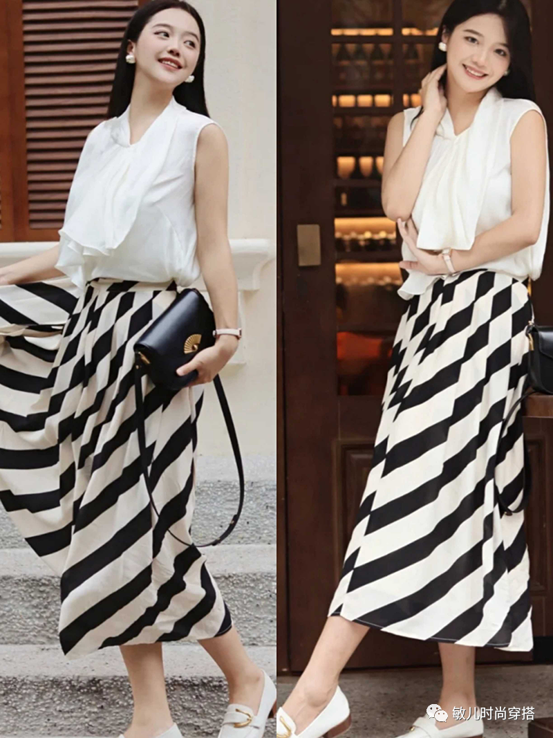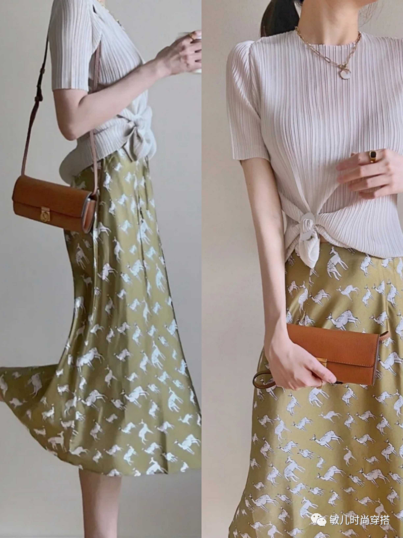 不过,在使用“花色”时,我们要多多注意繁简均衡。简单来说,如果穿了一件花色丰富的半身裙,我们可以搭配颜色素净的纯色上衣。穿了一件花色的上衣,则可以搭配纯色的下装单品。
