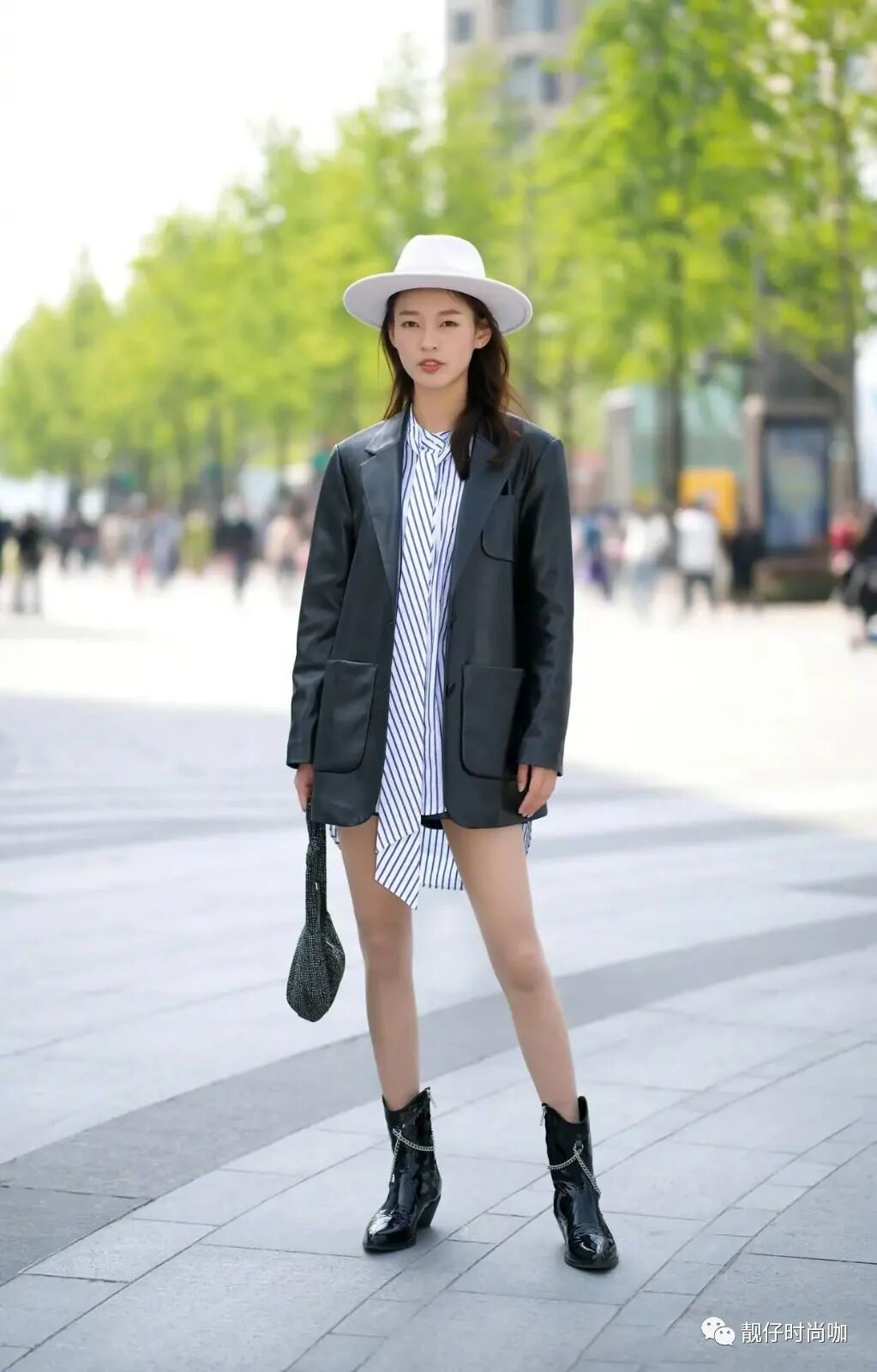 上衣选择条纹衬衣,瘦子可以对条纹的选择不用过于介意,但身材微胖的可以选择竖条纹,外套选择黑色的皮质夹克,下半身穿同黑色系的短裤,鞋子穿黑色尖头的靴子,看起来高级又时尚。