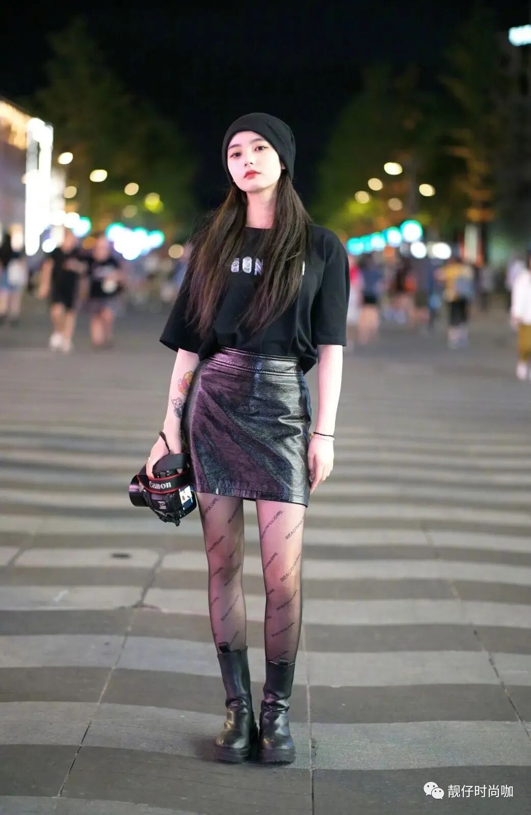 这样的穿搭超级酷,黑色短袖搭配一条黑色的紧身皮裙,不仅能够很好勾勒出女性的身材,还会多了一种妩媚的感觉。