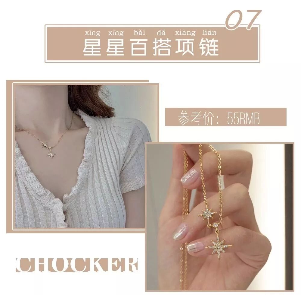 由一颗小珍珠和月亮组合而成,正好在锁骨之间,穿一字领、方领的衣服,超显气质。