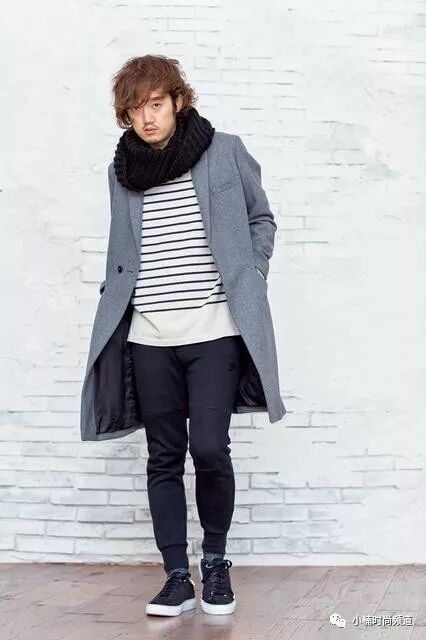 ▲ 以简单的发想,将正式的长版大衣与棉裤或条纹T混搭,借此降低休闲风格的比重。大衣/ADAM ET ROPE,条纹T/UNIQLO,长裤/NIKE,休闲鞋/Amb,围脖/ZARA