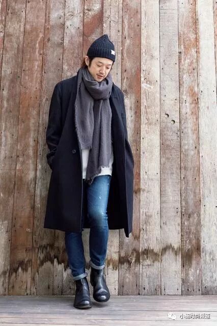 除此之外,长版大衣的长度很长,上半身会显得比较有分量(无论是横向还是纵向,都会增添分量感)。上半身有分量的话,基本上以「Y字形」线条为穿搭目标。下半身采用窄版的服饰是最简单的方法,搭蓝色丹宁裤时尽量选择窄版的款式即可。