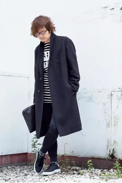 ▲ 就算是条纹衫加休闲棉裤,套上长版大衣就会变得简练沉稳。大衣、眼镜/UNIQLO,条纹T/MAISON KITSUNE,长裤/NIKE,休闲鞋/Amb,手拿包/aniary