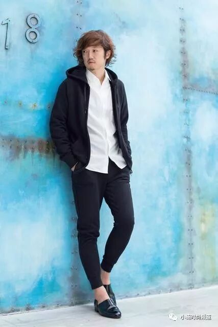 ▲ 上下身都是黑色,内搭白衬衫,脚上穿着皮鞋从远处看起来就像穿西装一样,但其实却是连帽衣加运动裤等休闲单品的高级穿搭方式。连帽外套、衬衫、长裤/UNIQLO,皮鞋/HARUTA