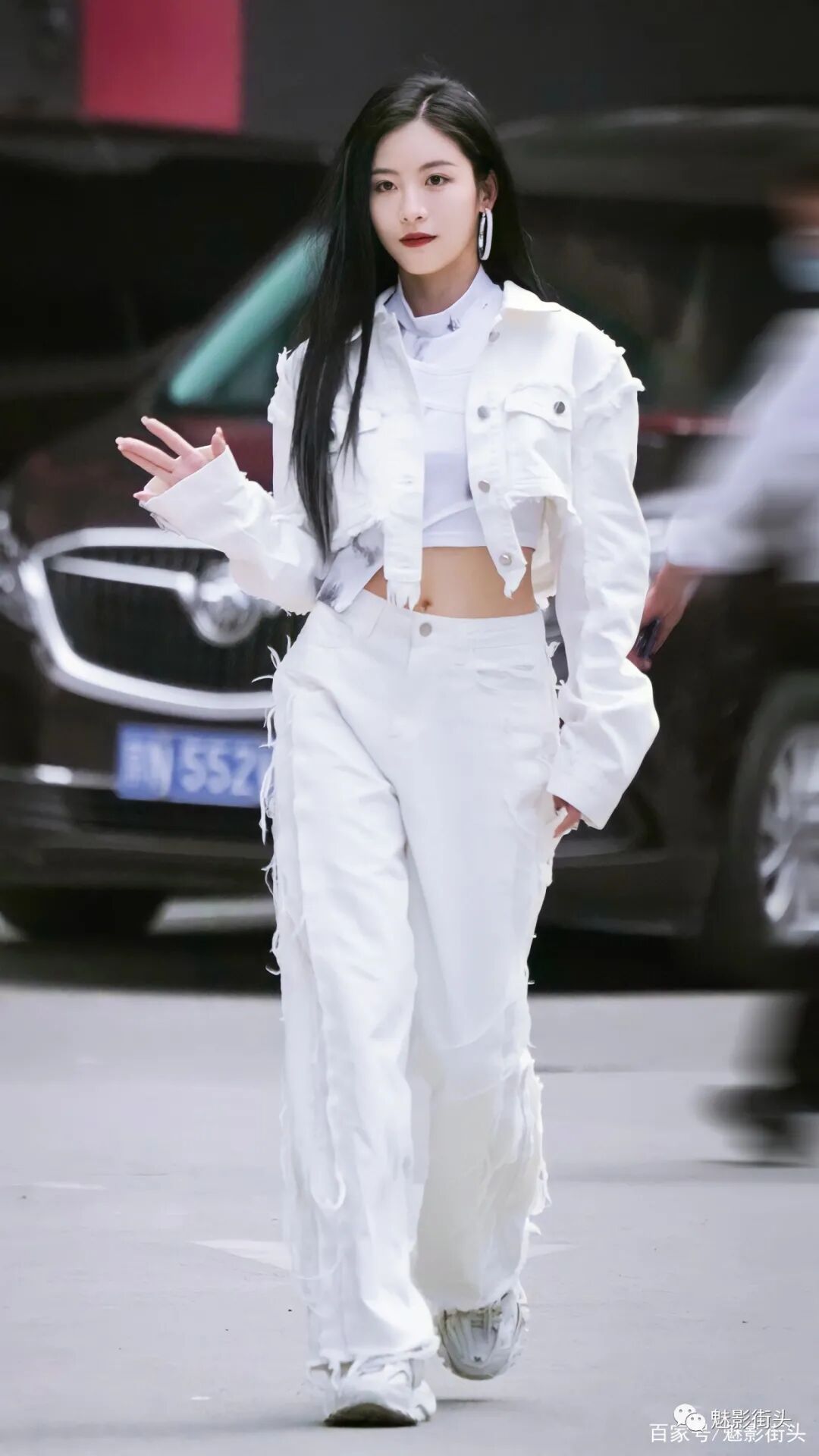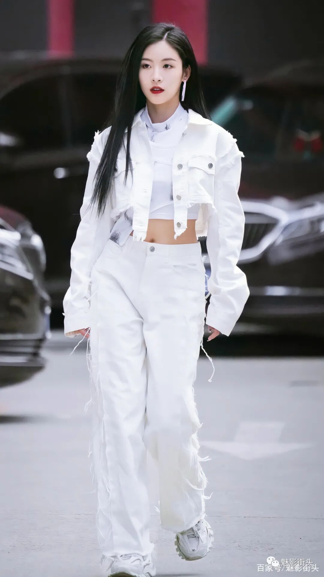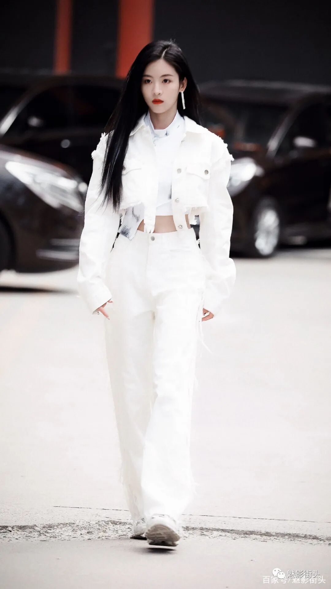 孙芮的这身全白搭配之所以清爽十足、又美又酷,主要还是良好的自身条件,无论颜值还是身材都为穿衣打扮奠定了非常好的基础。女生穿牛仔风格的套装,更能体现英姿飒爽的气质,其次白色牛仔比较少见,再加上大量的毛边设计,增加了时髦洋气的效果。披着一头乌黑亮丽的秀发,刘海斜分对瘦脸有着非常好的视觉效果。