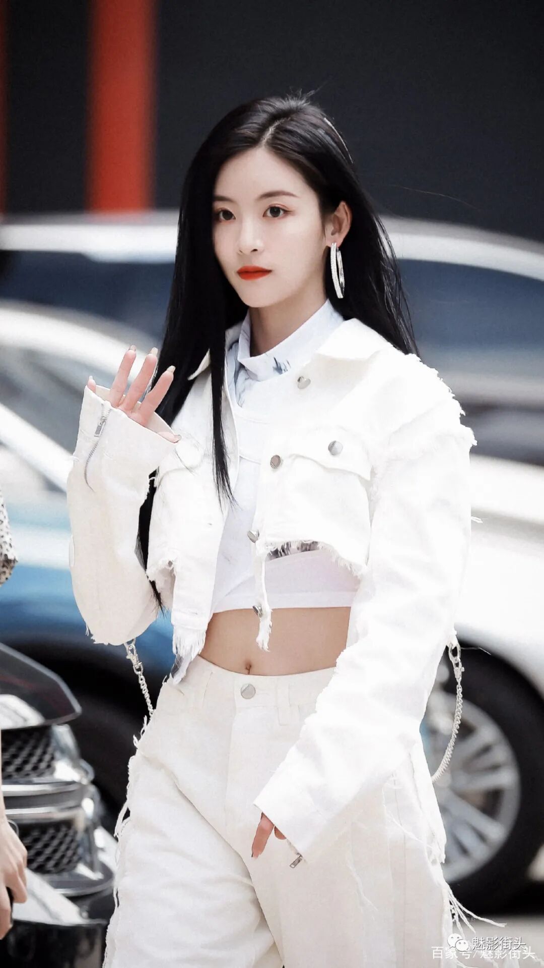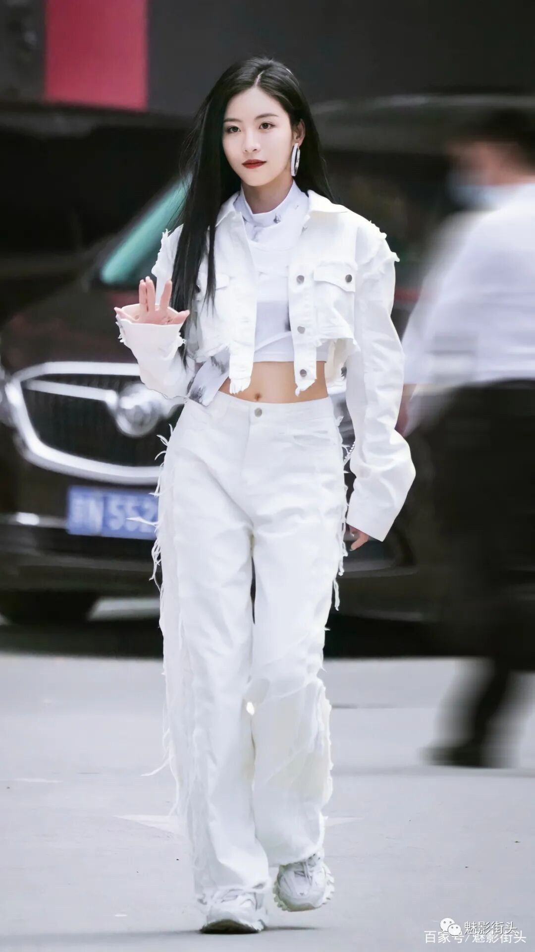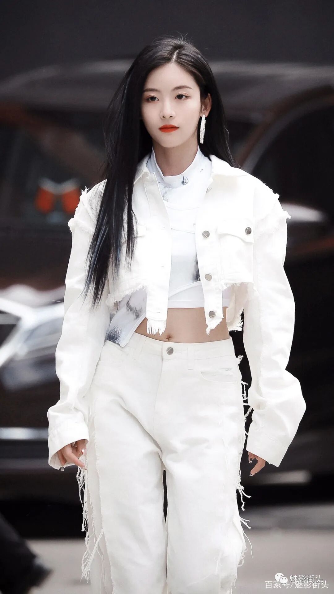 孙芮的这身全白搭配之所以清爽十足、又美又酷,主要还是良好的自身条件,无论颜值还是身材都为穿衣打扮奠定了非常好的基础。女生穿牛仔风格的套装,更能体现英姿飒爽的气质,其次白色牛仔比较少见,再加上大量的毛边设计,增加了时髦洋气的效果。披着一头乌黑亮丽的秀发,刘海斜分对瘦脸有着非常好的视觉效果。