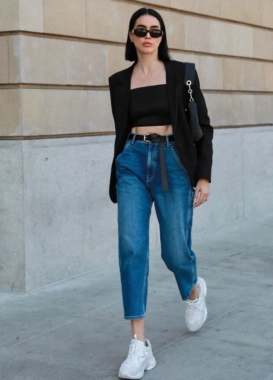 牛仔裤搭配抹胸,是小仙女在夏日喜欢的穿搭模式。九分长的锥形牛仔裤,版型宽松不挑人,再搭配一双白色的老爹鞋,舒适又方便,裤脚处露出的脚踝,是让老爹鞋凸显腿长的必要小心思。老爹鞋+连衣裙