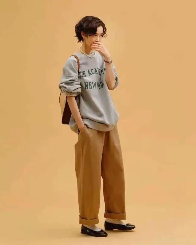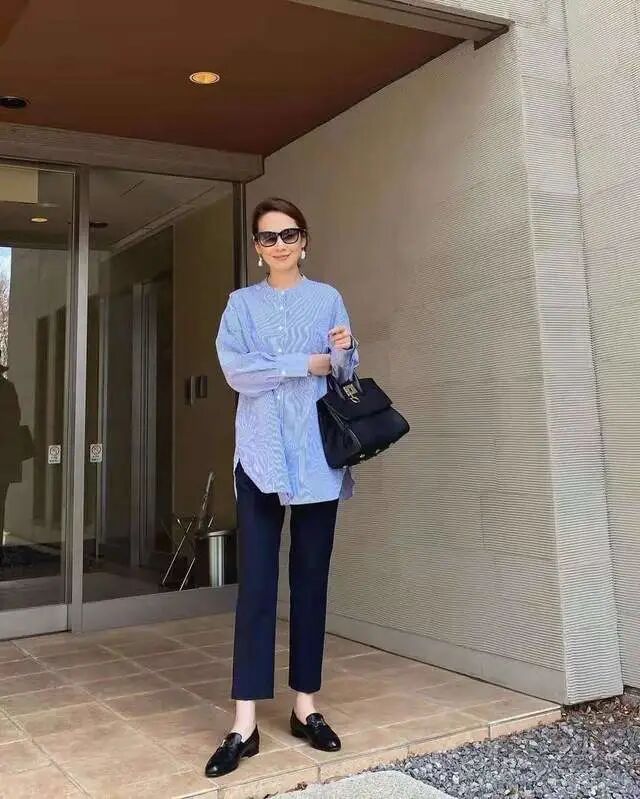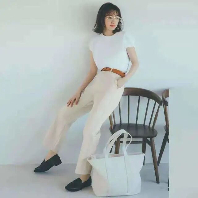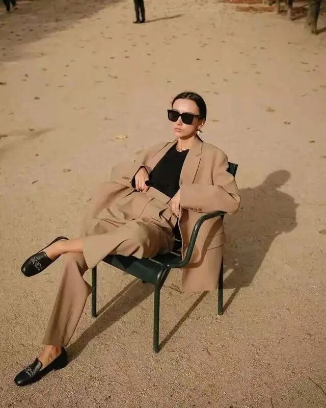 在裤脚与鞋面之间留下空白,露出脚踝时小个子女人必备的穿搭小技巧,适用于所有裤型。如这组穿搭,廓形西装外套+西装阔腿裤,整体版型偏大,很有轮廓感,配一双窄长的乐福鞋,露出脚踝,显得整个人轻快了很多。注意:方形的鞋头更加英伦复古,适合脚面宽的大脚女人。