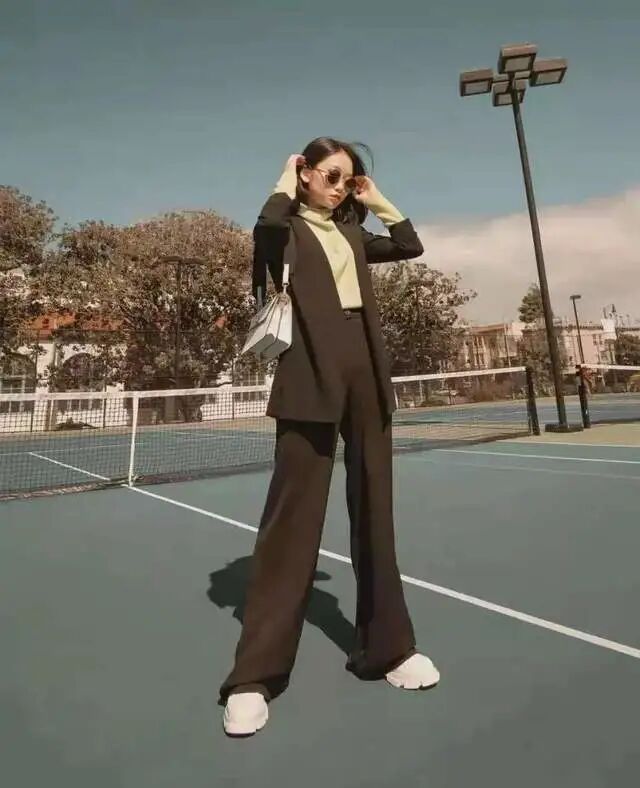 偏休闲些的阔腿裤垂感都会更好一些,如图中的这组穿搭,棕黄色阔腿裤+白色运动鞋,裤子与鞋子的风格属性高度一致,搭配起来特别和谐,配色也很不错,偏浅一些的颜色穿起来格外轻快。