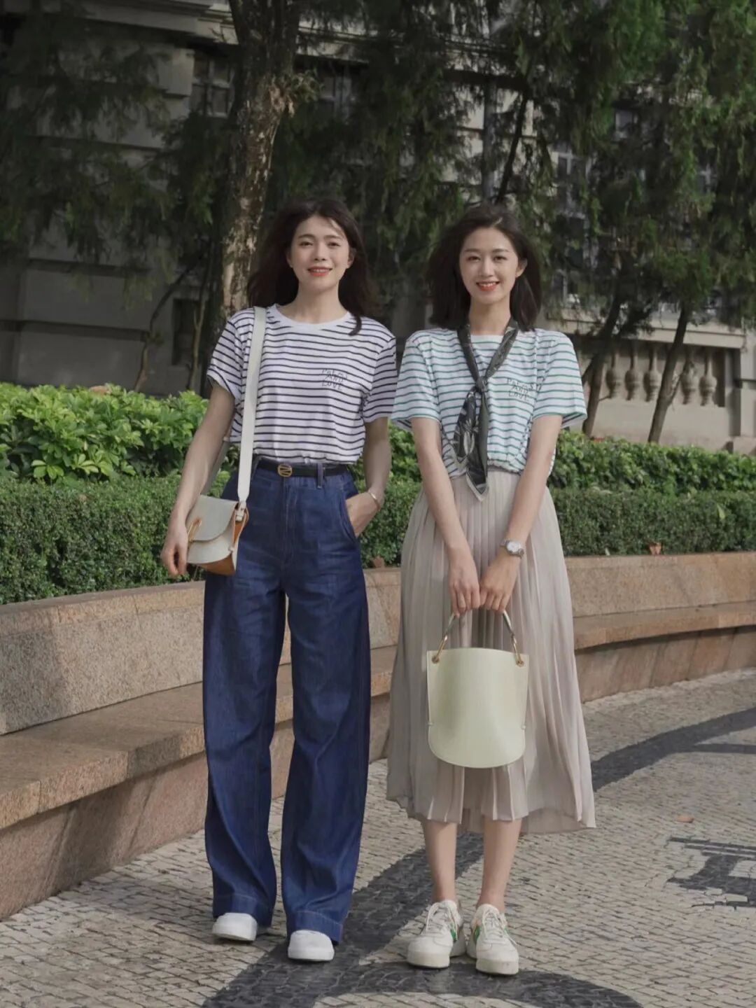 条纹元素基础、时尚,经典、百搭,它最好的归宿大概是浅色,比如薄荷蓝,比如黑白,它的存在,让牛仔裤多了一些柔美,让半身裙多了一些时尚,初夏关于T恤的主题,又怎么能少得了它的参与?▼四、T恤+半裙