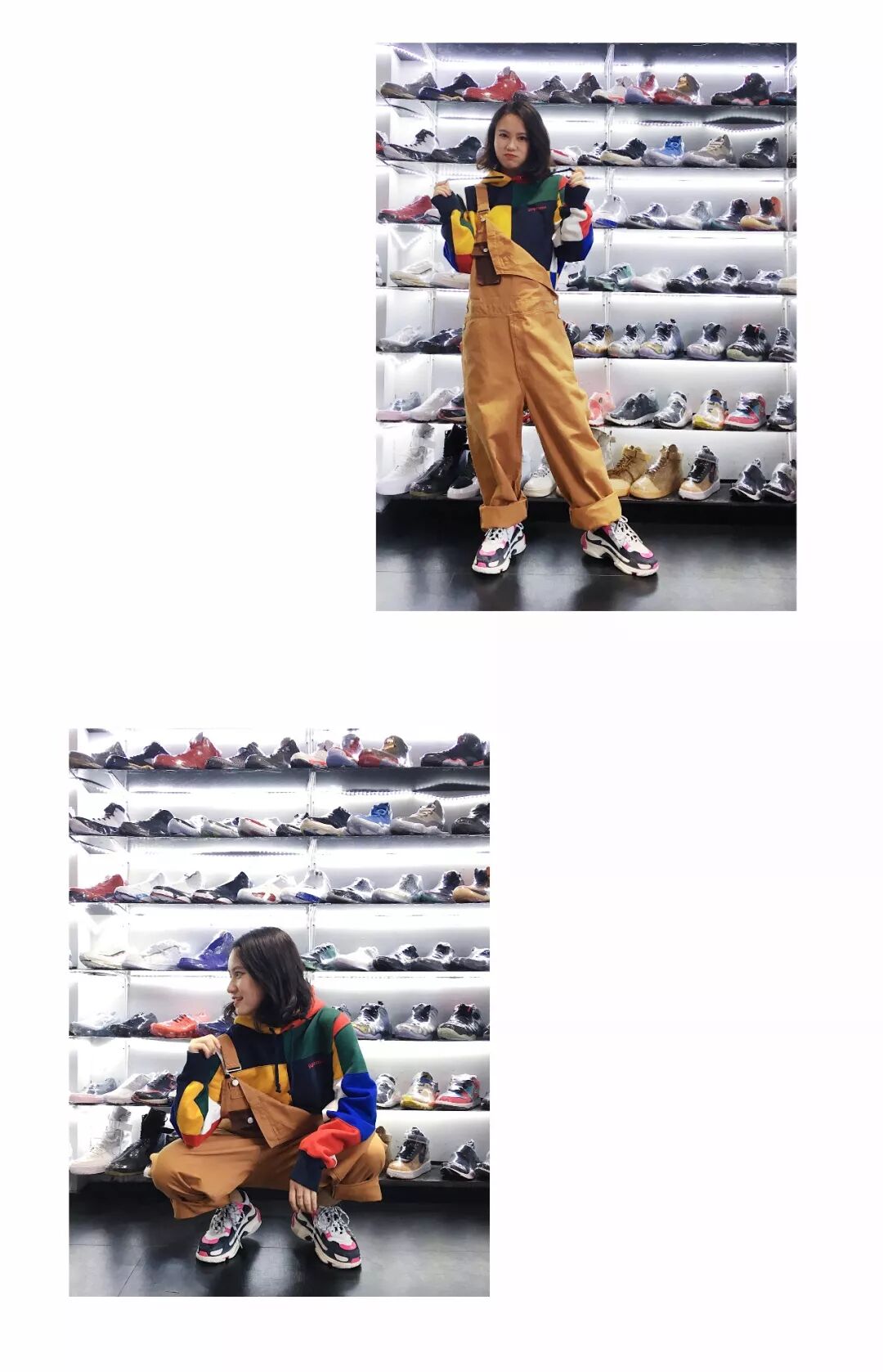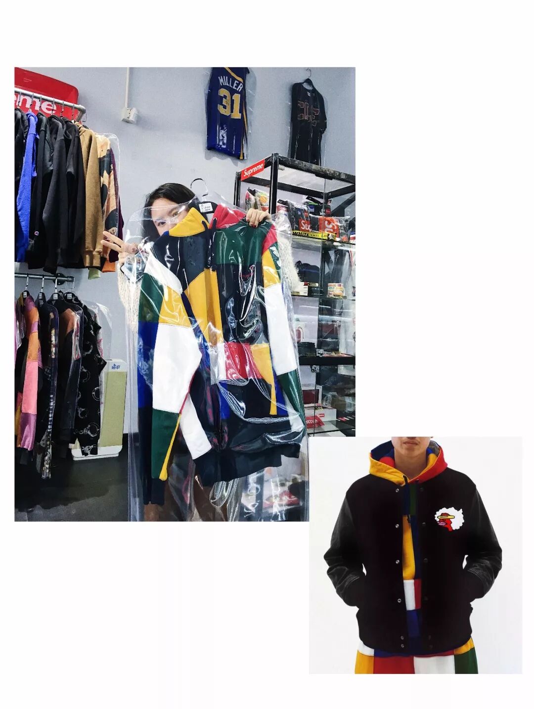 Z:第二套的这件 Supreme 卫衣,第一眼看到就很吸引我,各种颜色块的碰撞,非常有活力,就想说试一试,结果一穿上就爱上了!再搭配一条宽松的背带裤(只可惜过于宽松了 ),感觉回到了童年,非常有趣,啊哈哈哈哈!