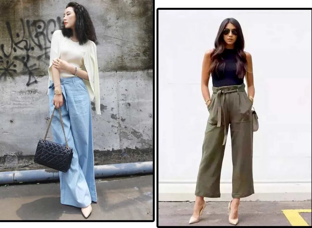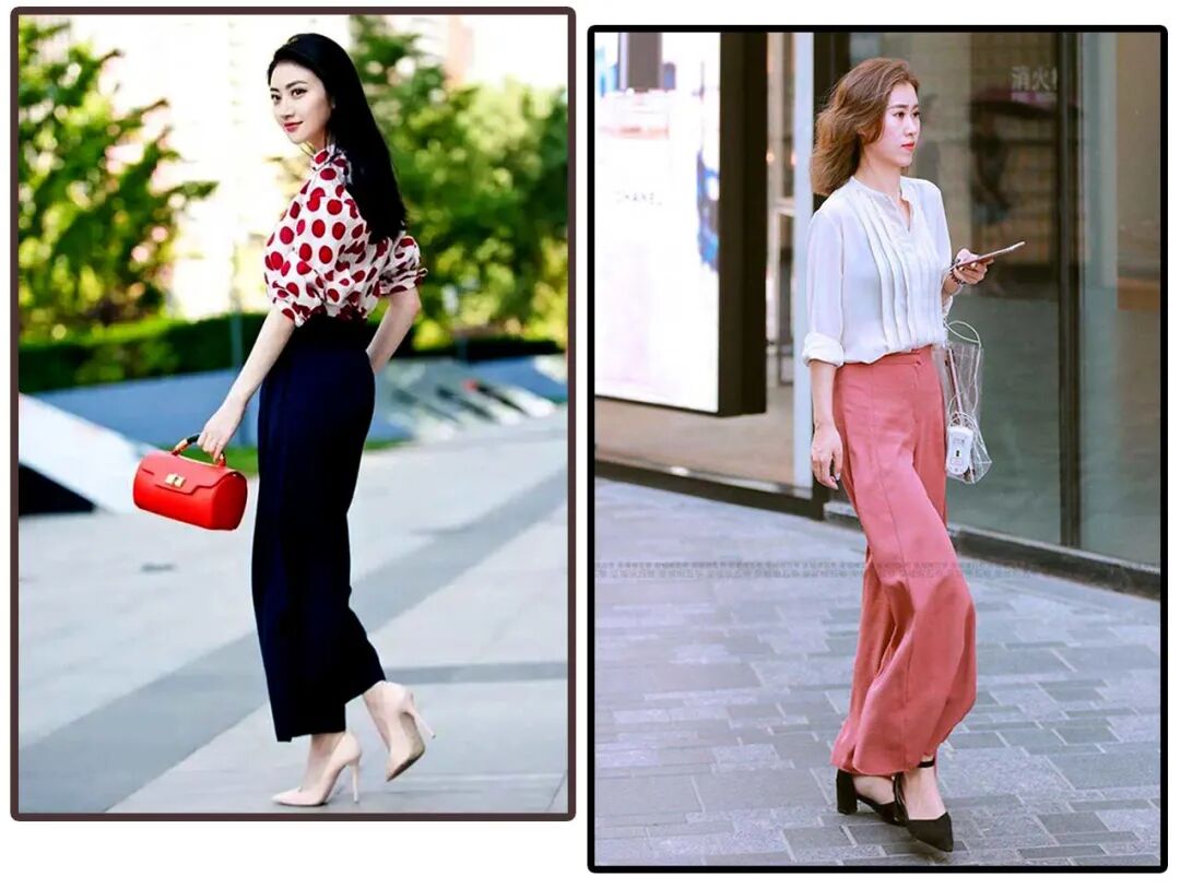 相对以上两组搭配,长度遮住脚踝只露出脚背的阔腿裤长度,更适合高个子,而右边露脚踝的阔腿裤配浅口高跟鞋则更适合矮个子。