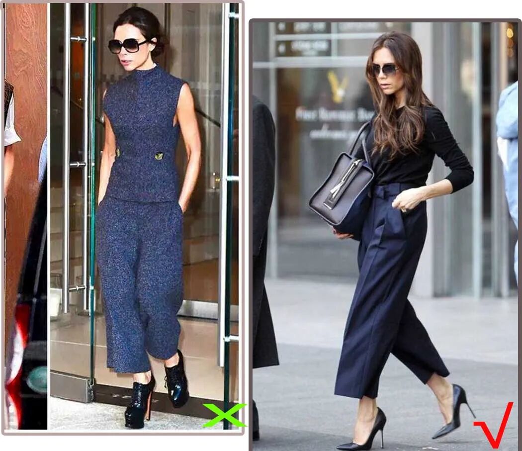 但是,选择高跟鞋款时,我们也要选对高跟的款型,比如以上两套贝嫂的阔腿裤搭配,明显驴蹄鞋那套搭配简直难以入眼,而右边尖头的鞋款则简约干练。