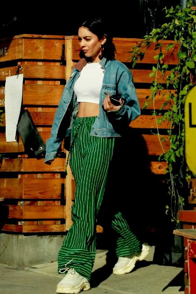 比如以上图这套搭配,绿色的条纹阔腿裤,配上米白色的老爹鞋,因为裤子的颜色比较出色,而米白色又作为经典的颜色之一,整体搭配比例刚刚好,所以总结得出,选择老爹鞋搭配阔腿裤,最好是长度过脚踝像这样打造出慵懒感会是不错的选择。