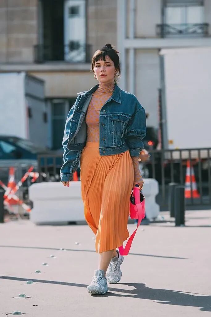 上半身印花打底衫中同样运用到了橘色元素,与半裙形成巧妙呼应,外凹短款牛仔外套,休闲又自由,穿出潮流风尚的同时,也蕴含着慵懒chic。