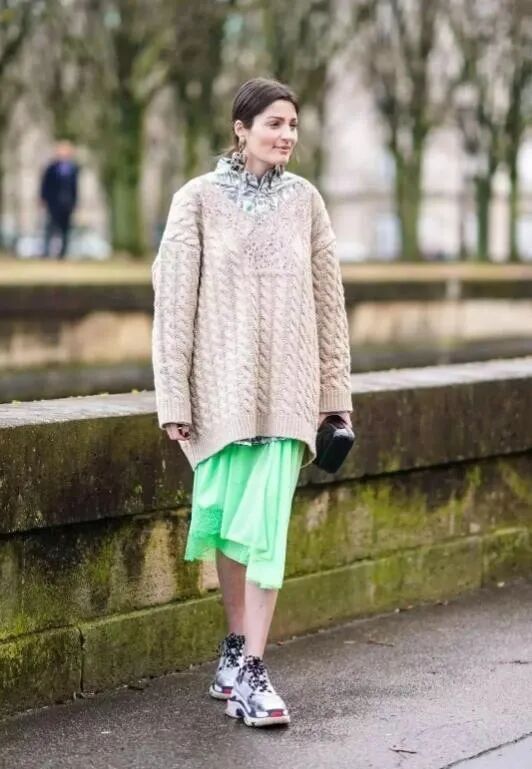 翠绿色的半裙充满清新之美,温柔且沁人心脾。搭配oversize奶茶色毛衣,既温柔典雅,又慵懒迷人。与印花衬衫叠穿,突出春日柔美风尚,整体look色彩的运用非常协调。搭配灰白红三色拼接老爹鞋,稳重休闲,又不失飒酷美韵。