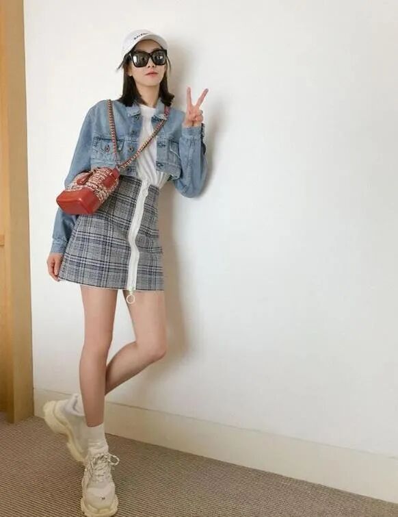 短款牛仔外套与白T叠穿,是街头潮拍中常见的搭配。白蓝相配优雅轻柔,亲和力也很强。搭配高腰格子半裙,休闲不失潮流风采。