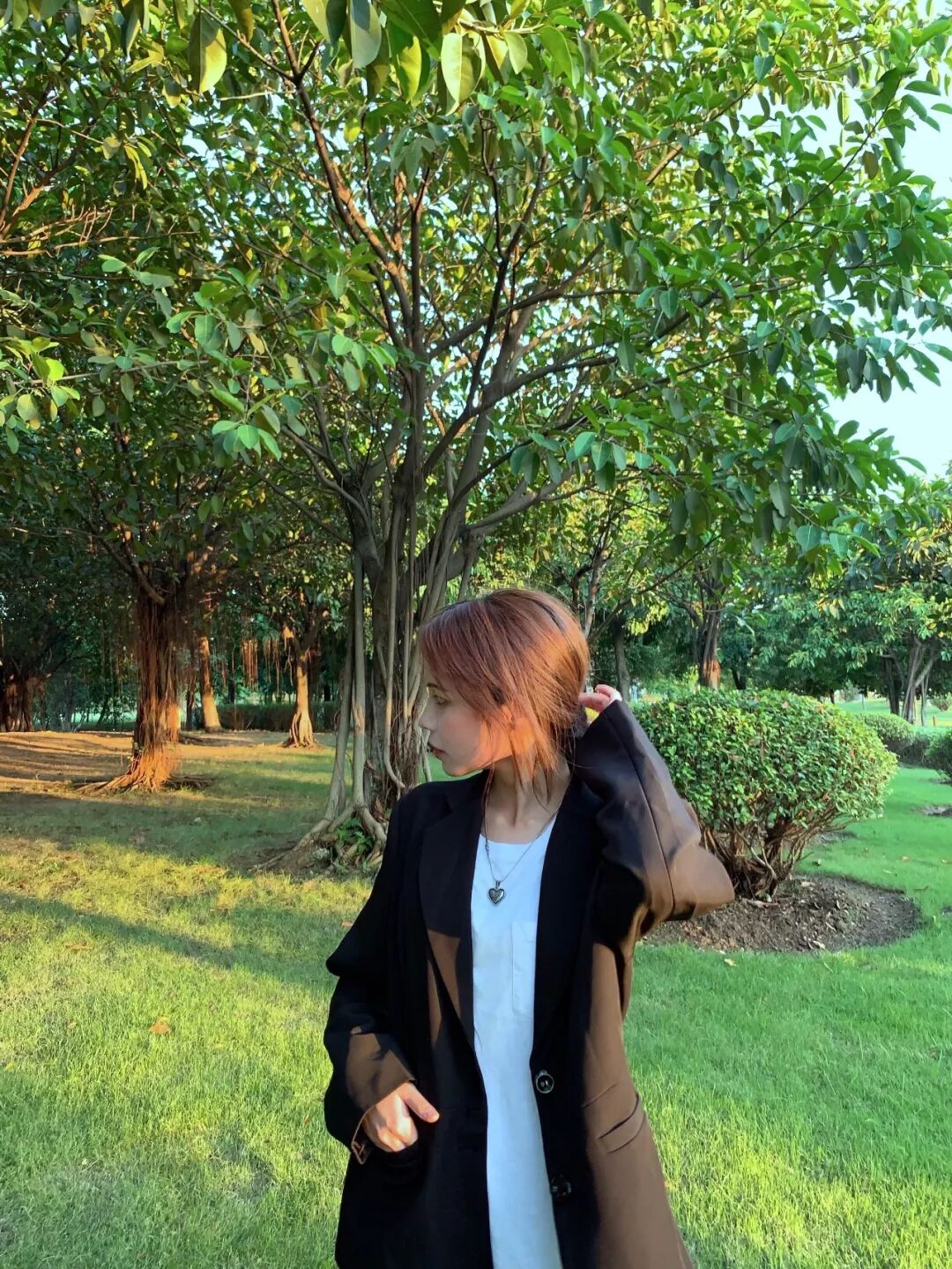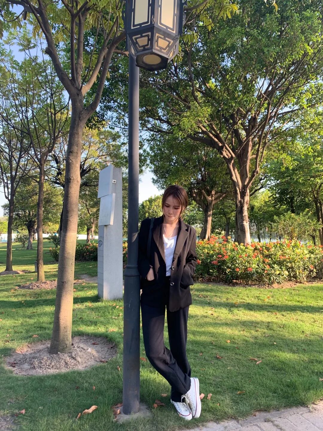 其实就在上一套的基础上也能穿上一个黑色西装外套。也很好看的简约朴素感。