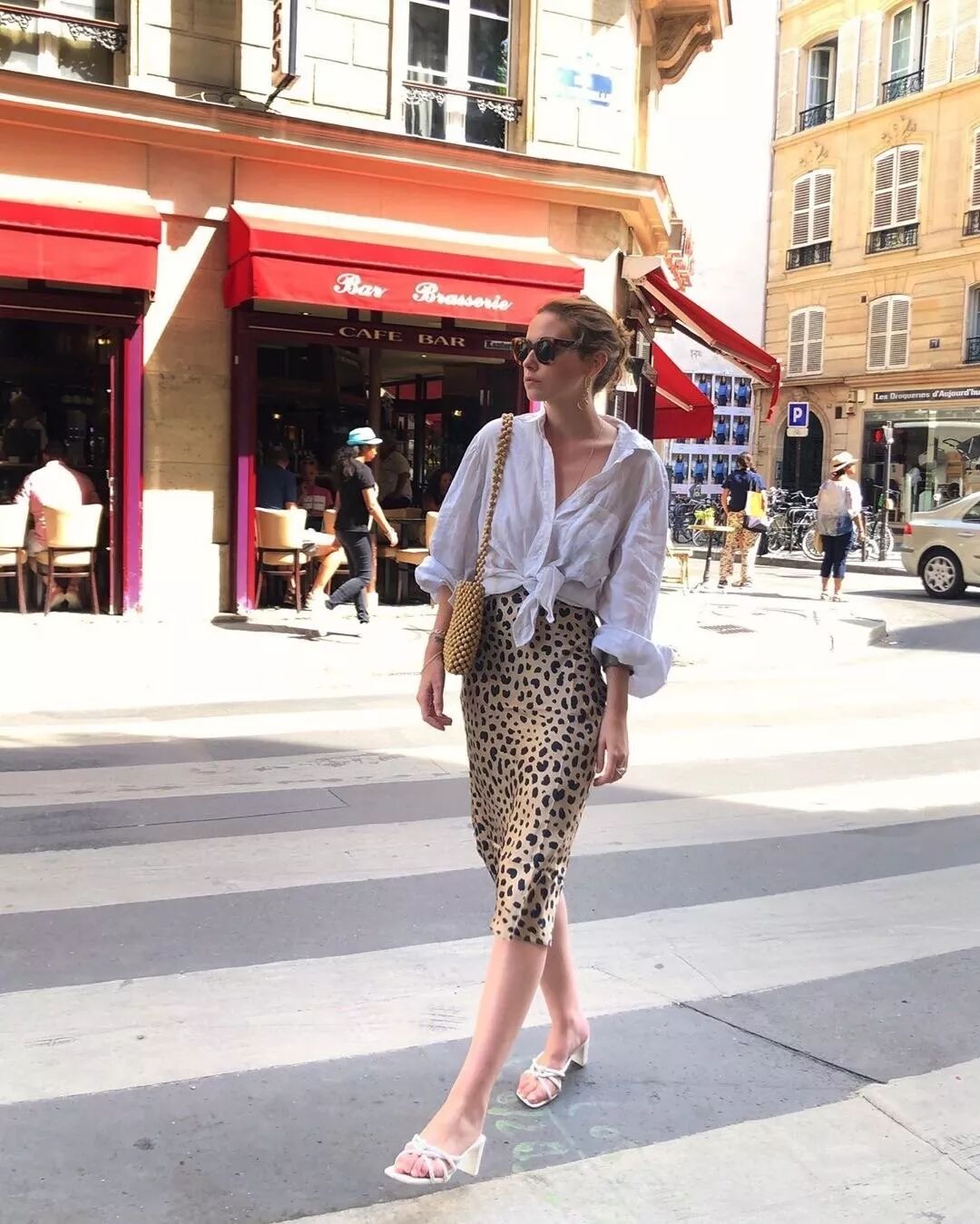 简单清新的白衬衫与野性十足的豹纹短裙搭配起来。简约清新中带着些野性。非常完美。
