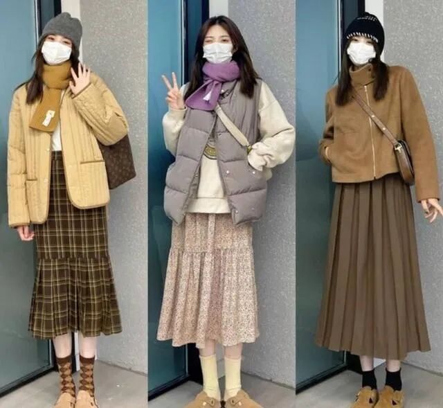 当然,有人喜欢裤子搭配自然也就有人喜欢裙装穿搭,冬日里的裙装穿搭,其实还挺丰富的哦!像这种短款的棉服外套,搭配漂亮的半身裙的穿搭方式,在冬日里还是蛮常见的,并且这种搭配方式,对于小个子女生来说特别友好,轻轻松松便可以穿出简单可爱的冬日时尚造型,所以深受大家的喜欢。