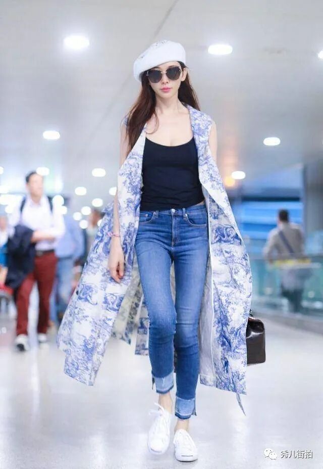 林志玲选择的这一件青花瓷的马甲就非常的有感觉,他本来就是复古型气质美女,非常的古典有气质,搭配的是一件简单的黑色T恤和深色紧身牛仔裤,刚好可以包裹住她优秀的身材曲线。