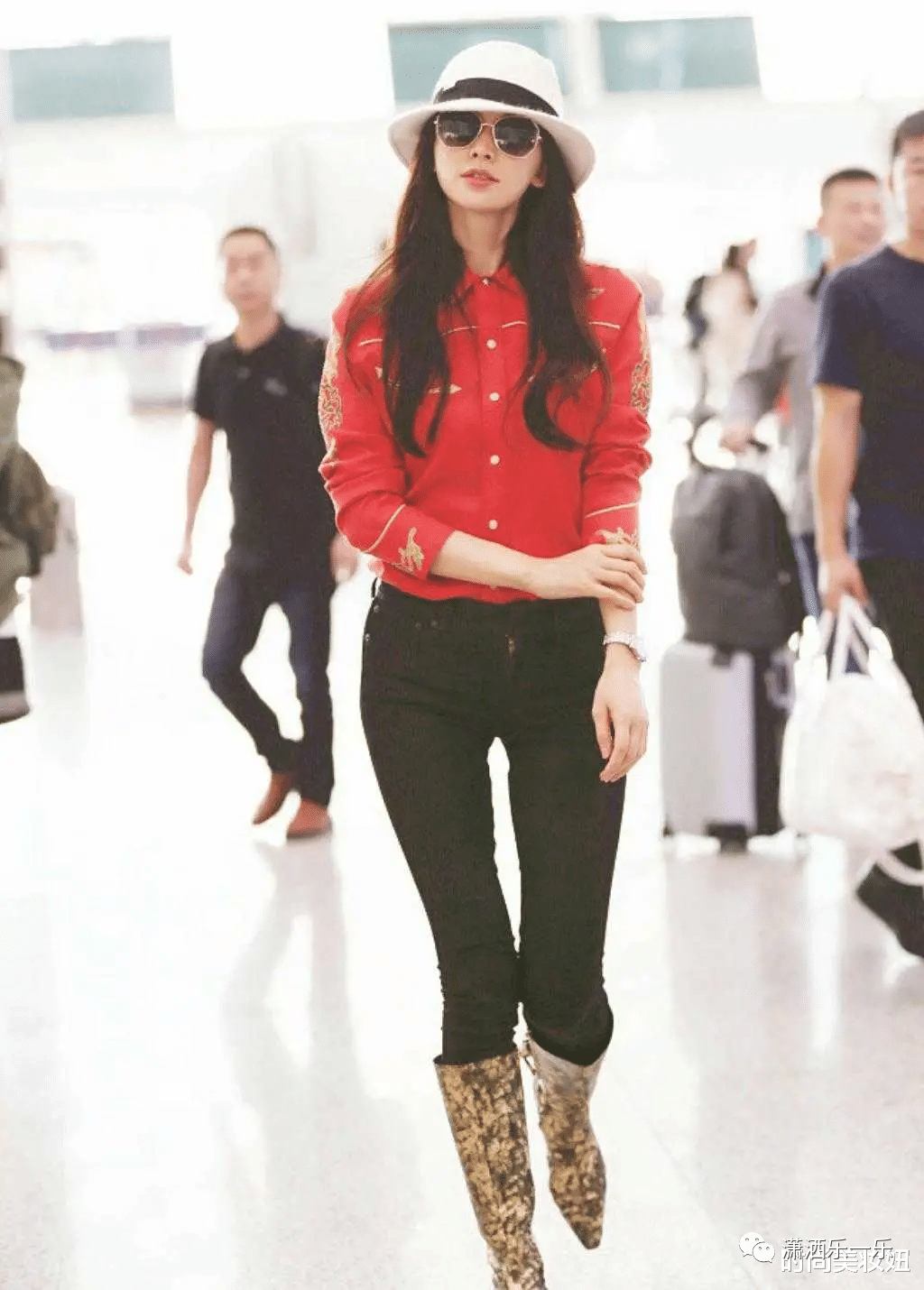红衬衫和黑裤子搭配。这次,充分展示了长腿的优点。脚上有一对光彩照人的闪亮中靴。这次的色彩搭配非常流行,但林志玲的照片的致命缺点是c部相对较宽,穿着短裤和修身裤时c部看起来会很大。