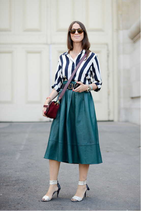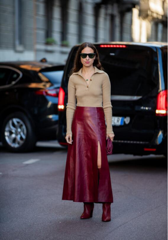 要是走酷飒路线的姐妹,就可以选择皮质面料的长裙,加上高开叉的设计,显得性感又迷人。由于皮质面料的存在感是非常强的,所以就选择纯色系得上衣来搭配它,就会显得有所侧重,非常有层次感,可以说是十分吸睛的了。