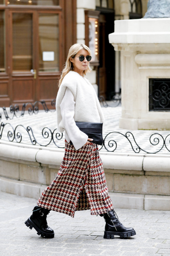 半裙可以说是非常百搭又好看的单品了,深受女性的喜爱,在法式风的穿搭中也是十分常见的。格纹的半裙,透露出一丝丝复古的气息,穿起来显得十分的典雅又高级。搭配复古的皮草上衣和马丁靴,真是特别的有气质呢,给人一种民国时期阔太太的感觉。