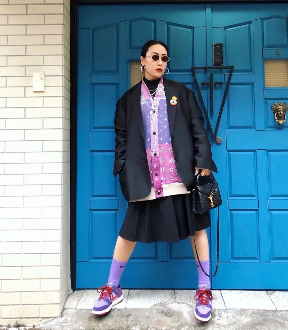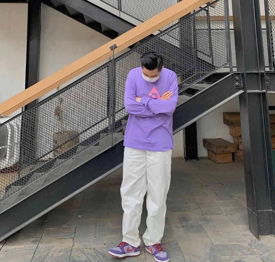 只选择单品进行搭配的话,我们一般会选择同色系上衣。一件粉紫色或者像鞋侧面一样的淡紫色长袖都可以很好的搭配上,现在是可以疯狂穿卫衣的季节,无论是深色工装裤还是浅色休闲裤都不会出错。