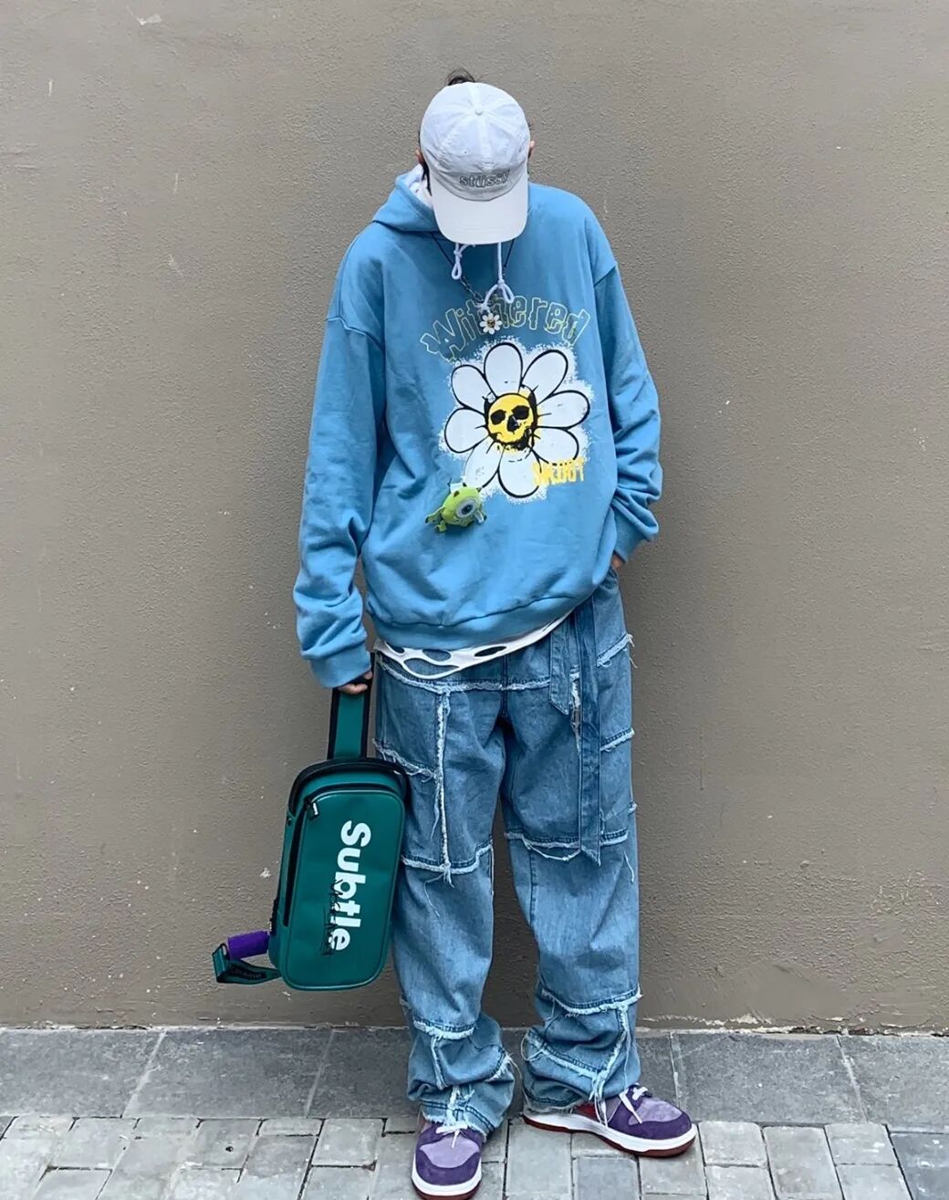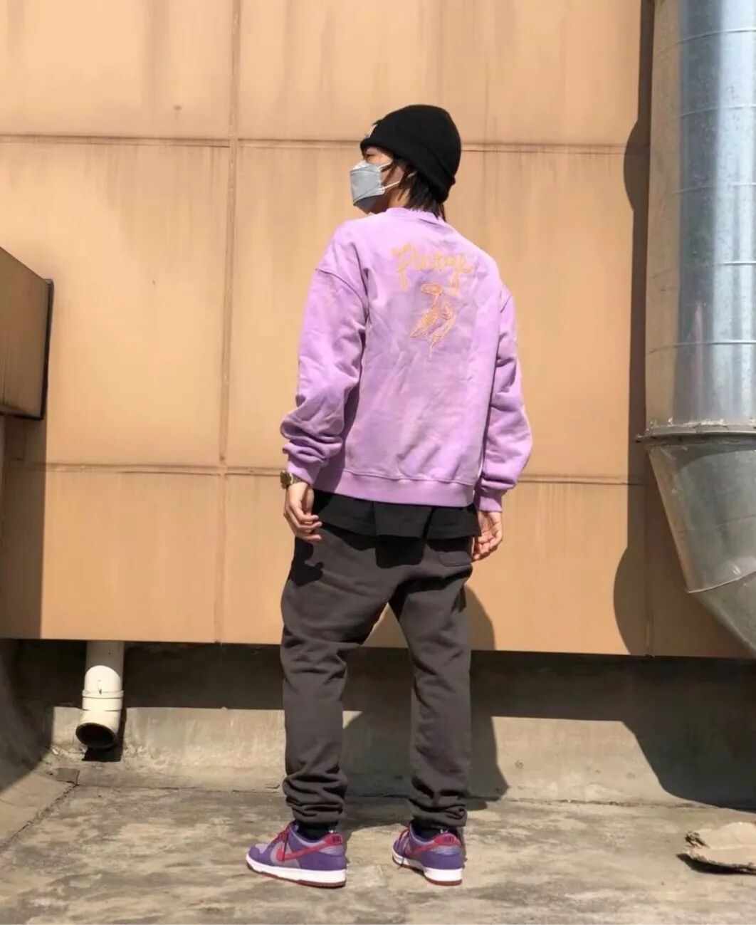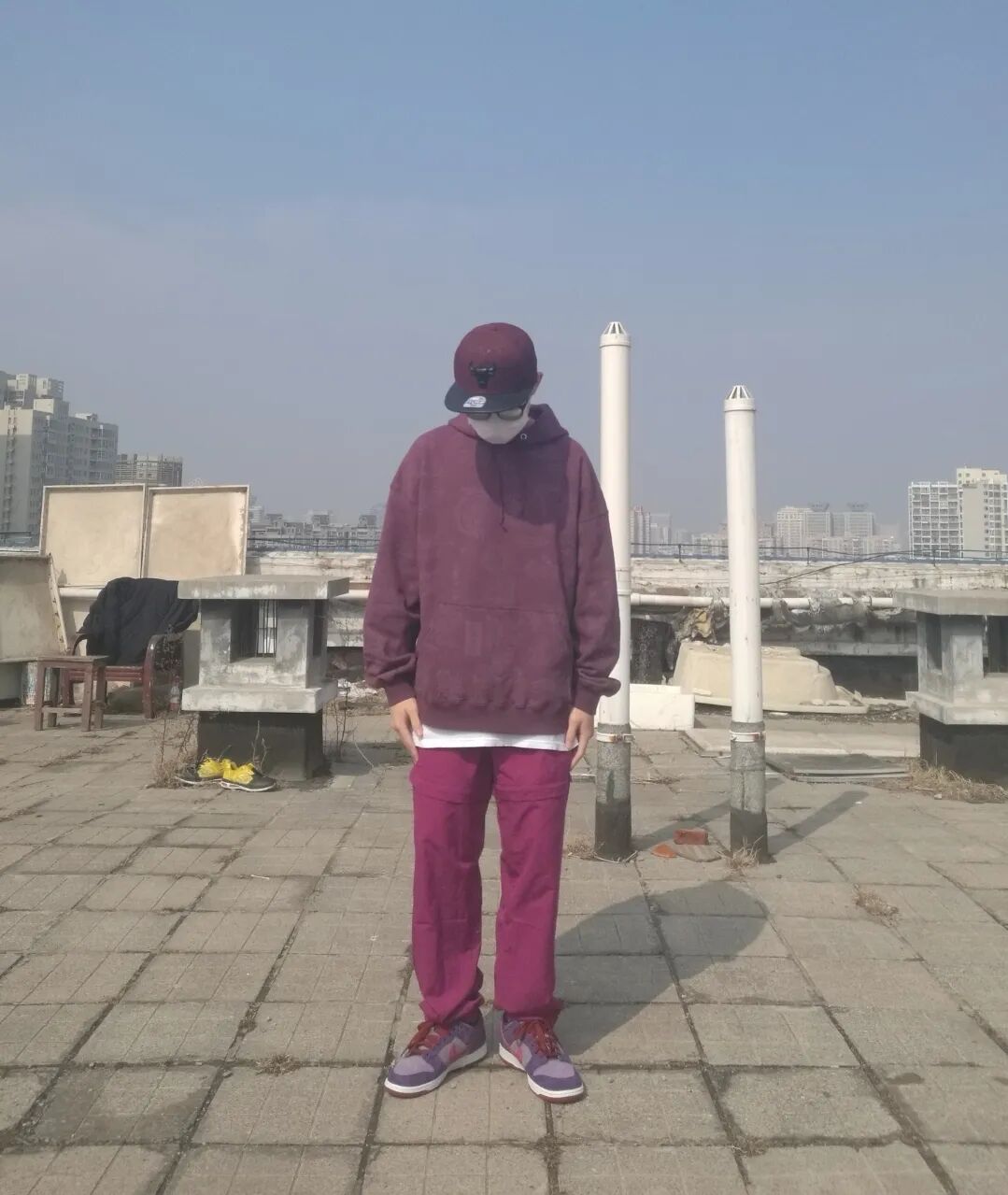 全身紫色如果不想全员恶人的话…还是需要用点心的,选择亮度没那么高的紫红色卫衣和卫裤,,现在的天气需要你放下尊严套件内搭来保暖,同时中和身上的单一颜色,简单的白色或者黑色即可,一顶同色棒球帽教他们认全紫色,别忘记衣服还是尽量宽松的好,毕竟你不是旺仔男孩。