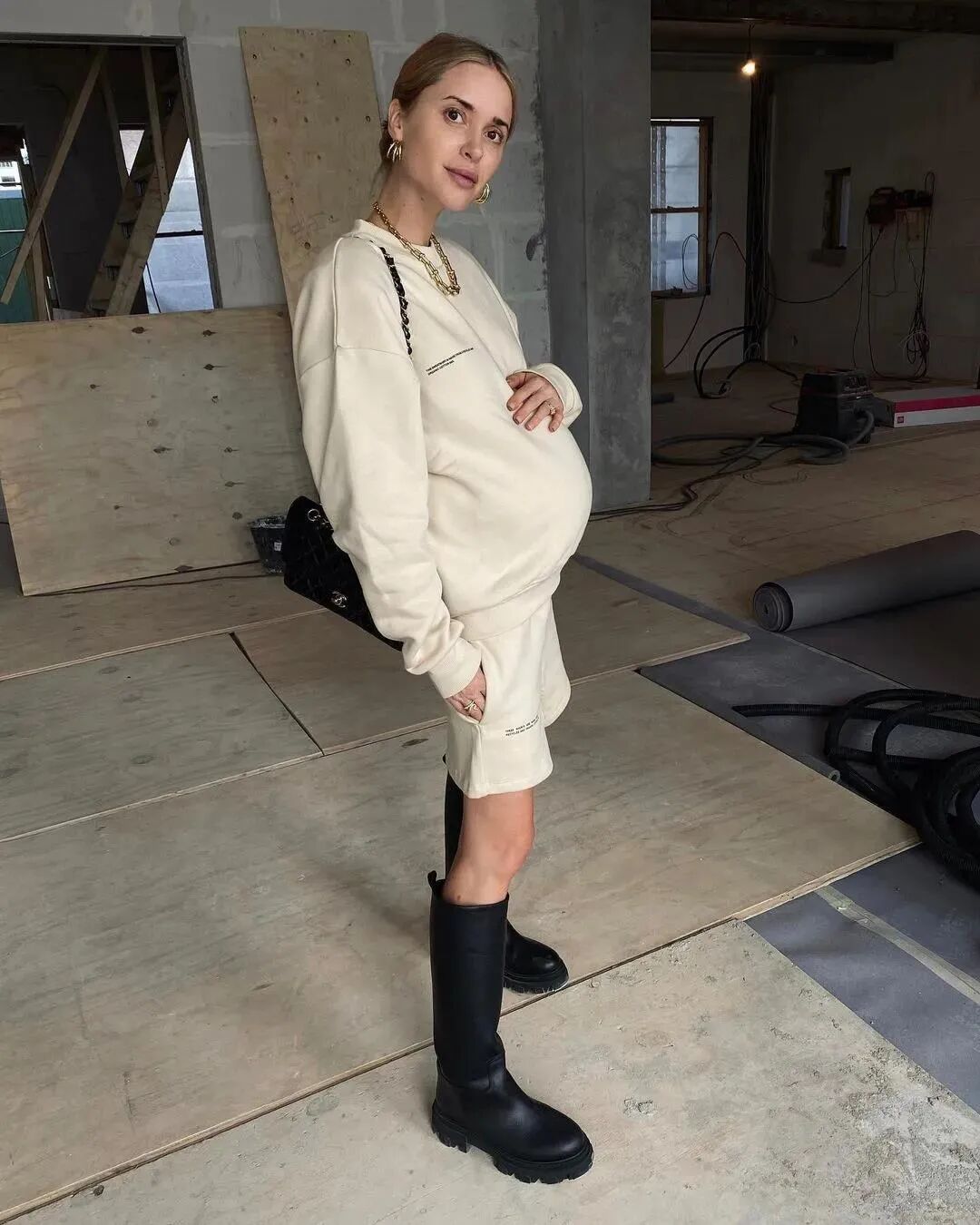 怀着宝宝的时候,一套短裤运动装配上一双烟筒靴,简直就是时尚界最潮的妈妈之一了。