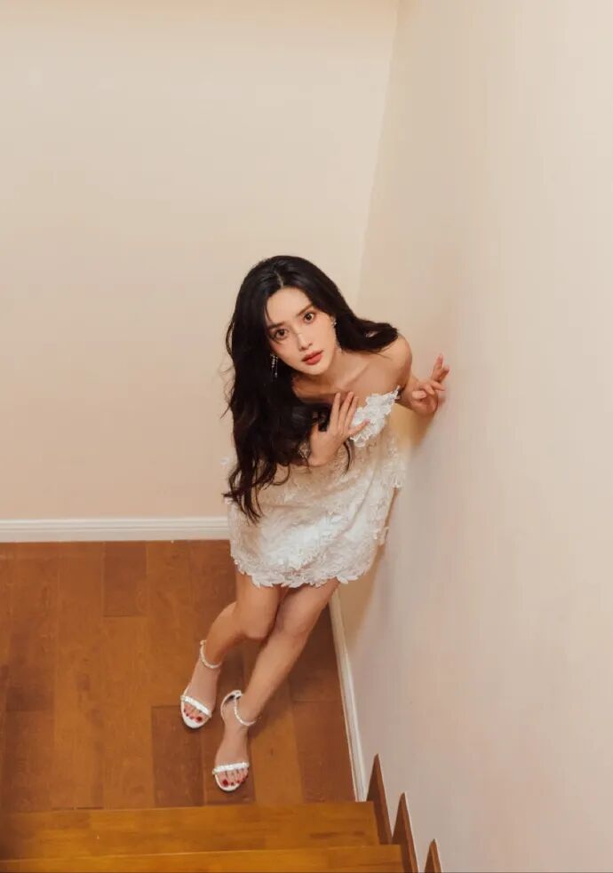 蕾丝,这个永不过时的元素,在她的演绎下焕发出新的生命力。白色蕾丝吊带紧贴肌肤,若隐若现间展现出优雅的锁骨线条.