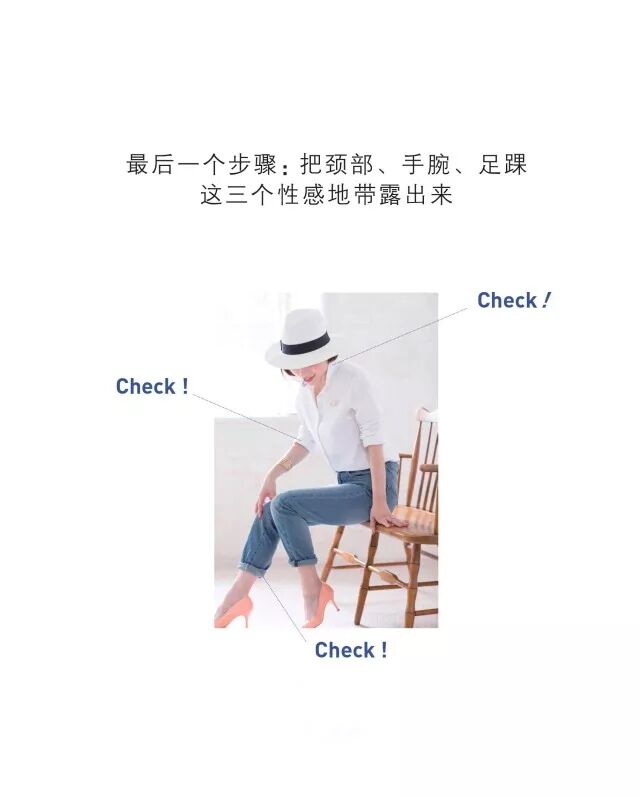“露出三个性感地带”法则是造型师的基本技巧。三个性感地带是指颈部、手腕、足踝这三处。因