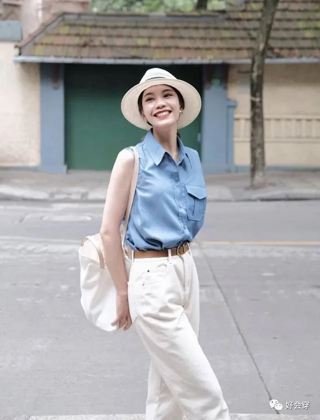 一件无袖衬衫可以说是清新的法式穿搭中最常见的单品了,这件牛仔蓝的无袖衬衫,翻驳领设计,尽显干净利落,非常适合职场中的女性穿哦!简约大气的设计,没有任何过分的修饰,搭配着一条白色的直筒牛仔裤,又是这种蓝白的清新配色,真的是屡试不爽哦!腰间的棕色腰带加以点缀和修饰,让整个造型瞬间提升了设计师的时尚感,而且还很好地凸显出纤细的腰身,完美地分割了身材比例,让整体显得更加优雅气质!