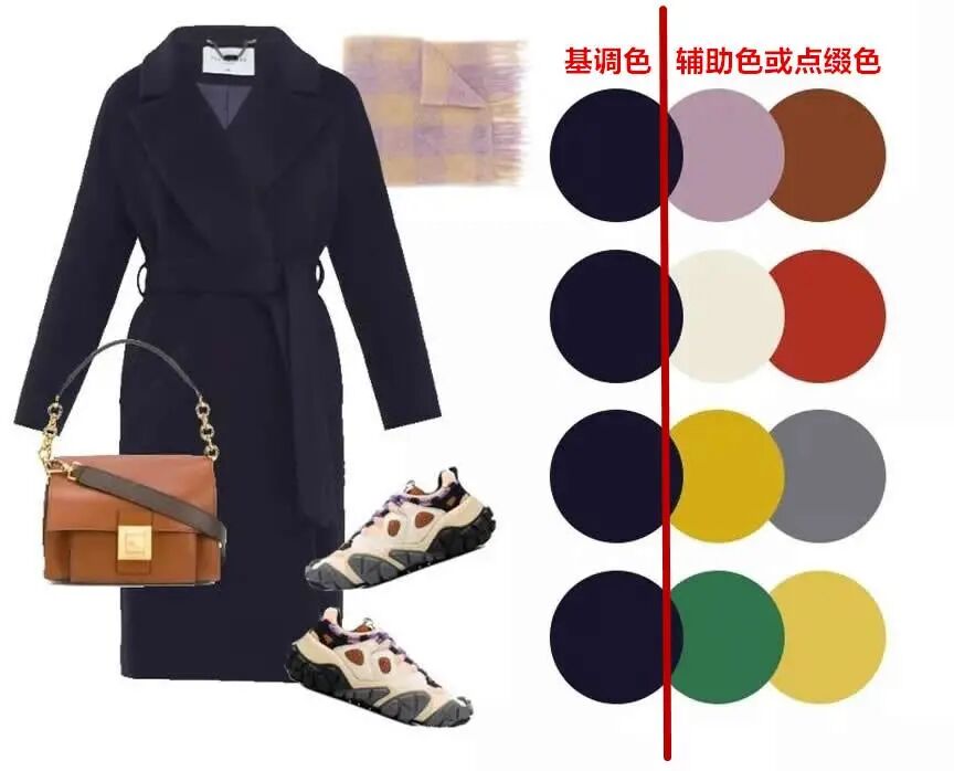 针对大衣,因面积最大,归属到基调色。就是说,大衣穿搭中的基调色已确定好,接下来就是选择辅助色或点缀色了。