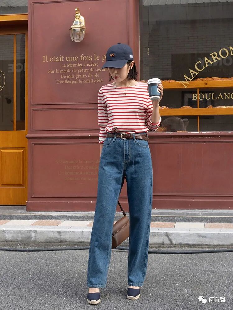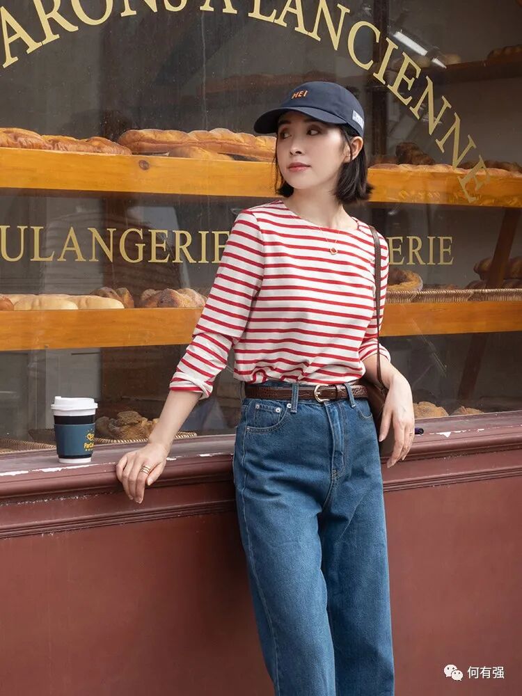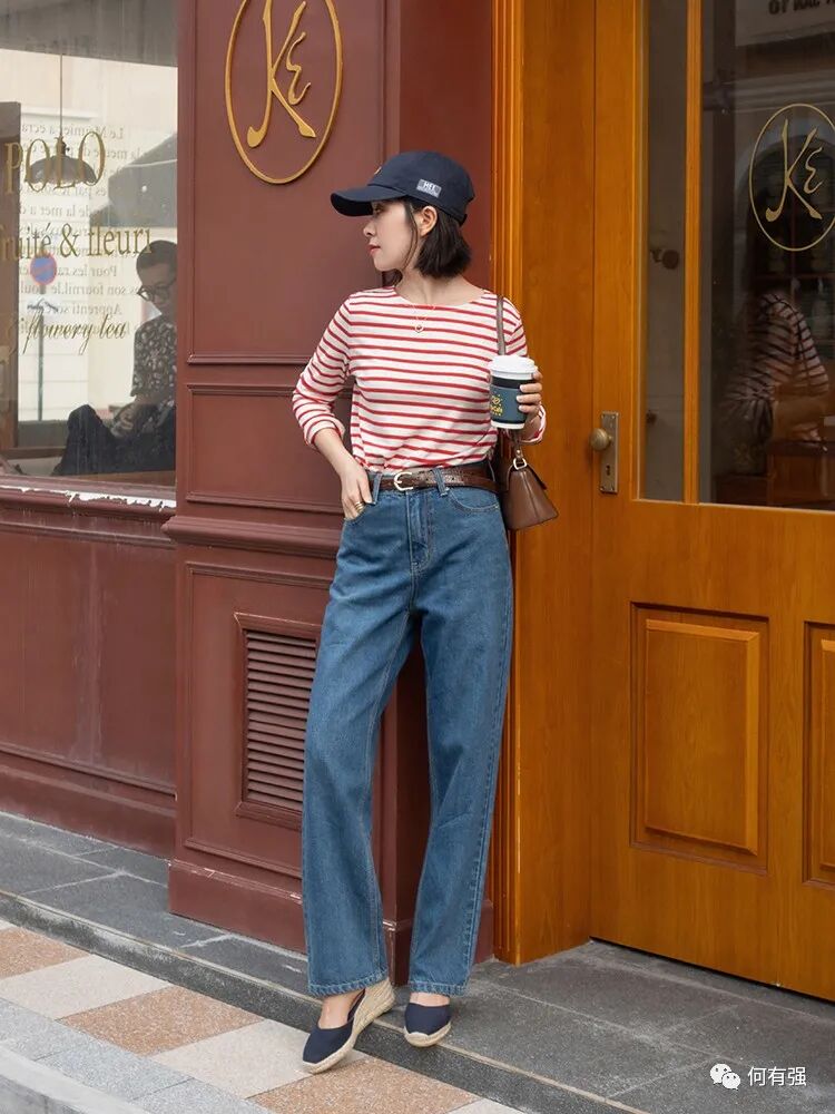 条纹款的圆领T恤简约又日常,这的间隔不是很密,线条也没那么细,大胆的红色比较有吸引感,比较越艳的颜色越能第一时间让你感观注意到,所以当你想让自己被更多人注意到时,不妨就穿比较艳丽的颜色,这样就很容易得到别人投来注视的目光。