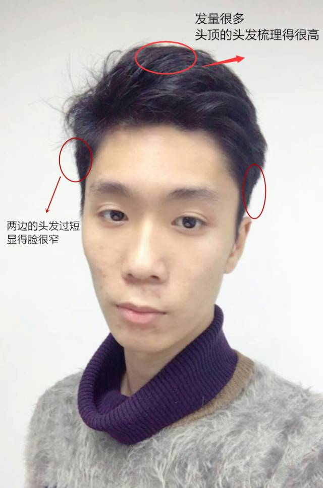存在问题:这位帅哥的发量很多,头发蓬松难打理,两边头发剃的过短,头顶发量显得较多,也梳理得较高,长形脸看起来比较长,所以要尽可能避免太短的两边,并且保持一定长度的顶端头发,不然会让脸型变得更长。