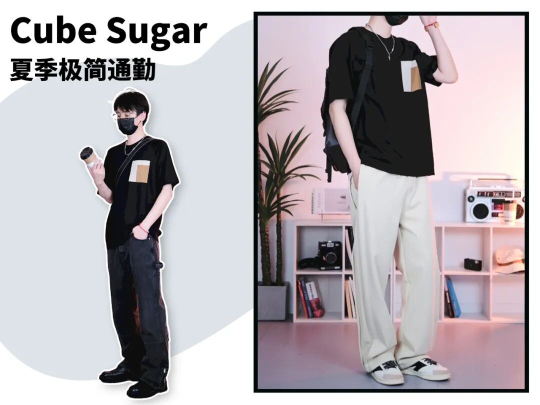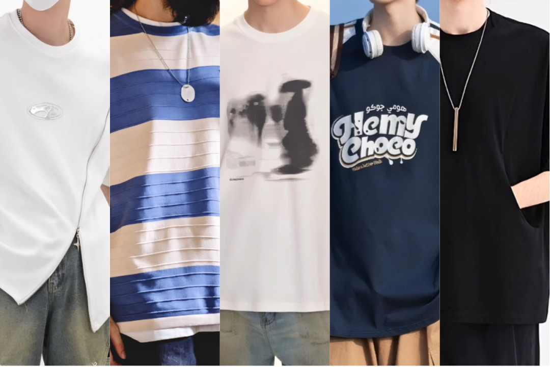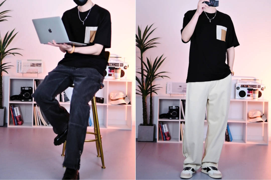 还有这种撞色T恤,也属于本身就有设计感的上衣。