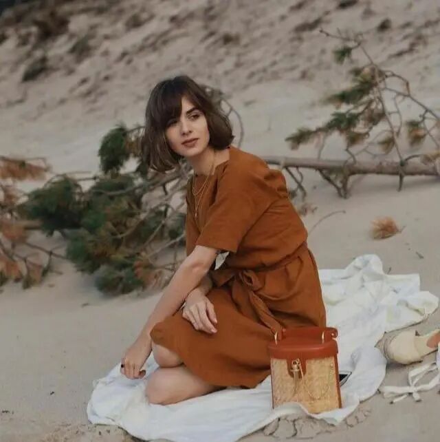 在这套棕色连衣裙中,一款很有质感的草编包增加了不少精致气息,在众多的草编包中,同样有不同的风格,休闲、精致等不一而足,可以选择稍微别致一点的款式,自带时髦属性。♥