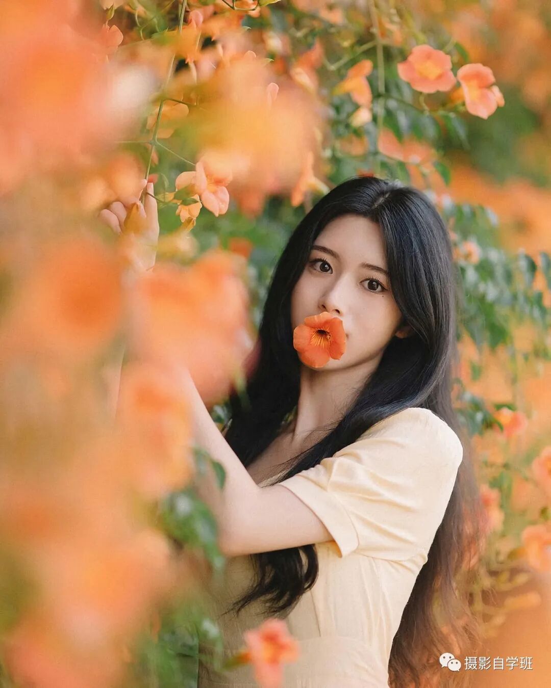 有的朋友以为穿裙子,就必须把裙子拍上,这是错误的,思维不要局限,即使是穿裙子拍照,也可以拍上图与下图,这种的半身照片。因为裙子照片,是整组照片,增加一些半身照片,可以让人的面部,被拍得更加清晰。为了增加照片的趣味儿,还可以像下图一样,让被拍摄的人,嘴里叼着一朵花。