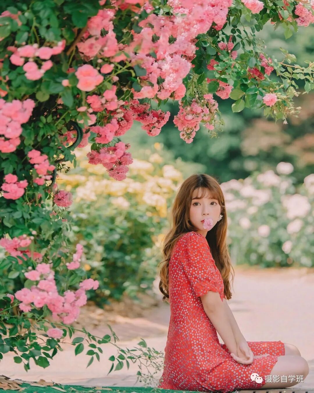 夏天穿裙子,一定要体现出曲线美,我们可以,以一面花墙为背景,让被拍摄的人,站在墙边,一手拿着花放到耳朵边,另外一手提起裙角,两个手没有僵硬的下垂,而是都摆出,体现曲线的姿势,看起来就会更优美。同时还可以像下图这样,把镜头与被拍摄的人,距离近一点,这样遮挡镜头的花瓣,就能形成虚化的前景,让裙子的照片,体现曲线美的同时,还有层次感。